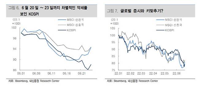 외국인은 이달 들어서만 국내 주식시장에서 5조3760억원을 순매도하면서 주가를 끌어내린 주범으로 자리매김하고 있다. 여기에 연준이 7월에도 기준금리 인상을 예고하고 있어 한국과 미국간 기준금리가 역전될 수 있다는 우려도 국내 주식시장의 불안 요인으로 꼽힌다.