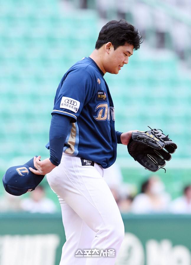 NC 선발투수 신민혁이 26일 인천 SSG랜더스필드에서 열린 2022 KBO리그 SSG와의 경기 4회말 2사 SSG 한유섬에게 동점 솔로 홈런을 허용한 뒤 아쉬워하고 있다. 2022. 6. 26.
