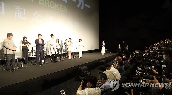 (도쿄=연합뉴스) 이세원 특파원 = 영화 '브로커' 일본 개봉 사흘째인 26일 오후 도쿄의 한 영화관에서 열린 무대 인사 행사에서 취재진이 고레에다 히로카즈 감독과 송강호·강동원·이지은(아이유)·이주영의 모습을 카메라에 담고 있다. 2022.6.26