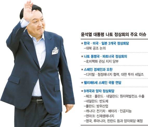 본행사에선 북한 비핵화에 대한 지지 확보가 주요 목표지만, 윤 대통령은 9개국과의 양자 정상회담을 비롯해 스페인 재계인사들과 오찬을 통해 한국에 대한 투자 촉구와 중남미 등 제3국 공동진출 방안 등을 타진한다.