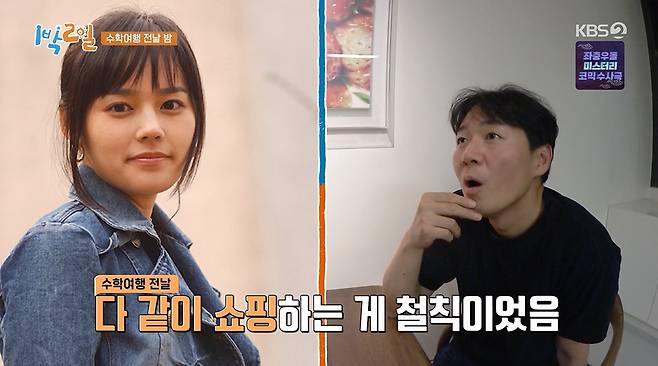 연정훈은 "원래 여보도 옷 사갔냐"고 물었고, 한가인은 "원래 수학여행 갈 때 옷 사지"라며 "그 시대에 유행하는 옷을 그때 딱 입고 가는 게 간지다. 옛날 수학여행 사진 보면 언니들 다 머리 세우고 청바지 입고 청재킷 입고 그랬다"고 답했다.