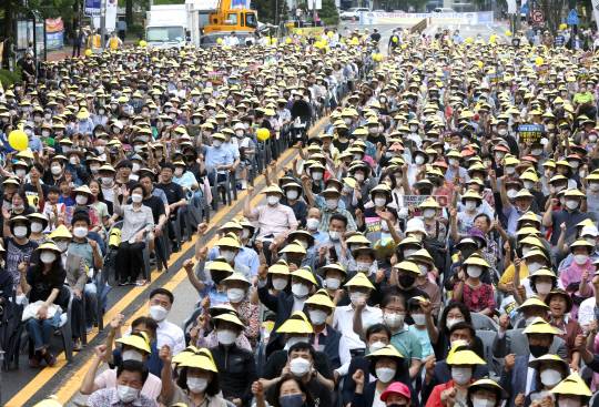 '차별금지법 제정 반대' 대규모 집회가 26일 대전 서구 시청북문 앞 도로에서 열려 주변 일부 도로가 통제 됐다. 이날 집회에 참여한 차별금지법 제정반대 대전시민연대 등 지역 시민사회단체들이 제정반대 구호를 외치고 있다.