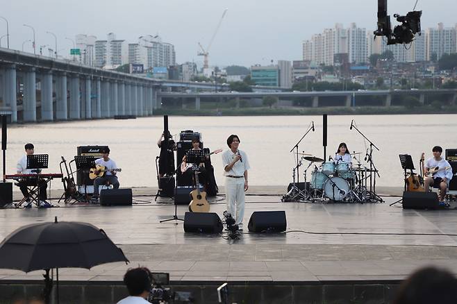 [서울=뉴시스] 정병혁 기자 = 가수 이무진밴드가 26일 서울 서초구 반포한강공원에서 열린 625-625 한강버스킹에서 공연을 하고 있다.(사진=서울지방보훈청 제공) 2022.06.26. photo@newsis.com *재판매 및 DB 금지