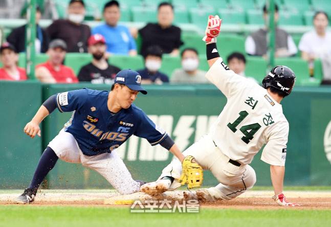 SSG 최정이 26일 인천 SSG랜더스필드에서 열린 2022 KBO리그 NC와의 경기 6회말 1사 1,2루 상황에서 2루에서 3루 도루를 하고 있다. NC 3루수는 노진혁. 2022. 6. 26.