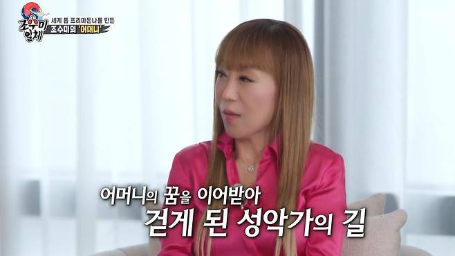 이날 조수미는 “어린 시절 어머니에게 투정도 많이 부리고 못된 말도 많이 했다”면서 “내가 4살 때부터 피아노를 배웠는데 하루 8시간 동안 피아노 연습을 해야만 방문을 열어주셨다. 어머니는 성악가를 꿈꿨지만 현실에 부딪혀 이루지 못하셨다. 내가 그 꿈을 대신 이뤄주길 바라신 것”이라고 밝혔다.