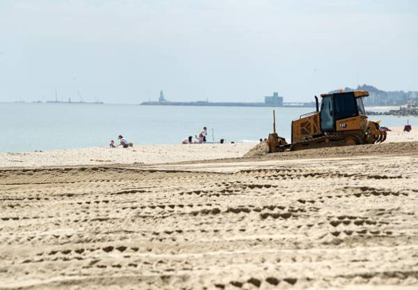 다음 달 8일 개장하는 강원 강릉시 경포해수욕장에서 지난 24일 관계자들이 백사장 평탄화 작업을 하고 있다. 연합뉴스