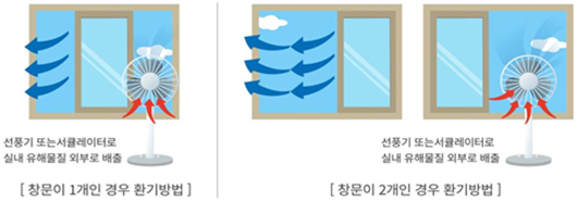 기계환기설비가 도입된 곳이라면 외부 공기 도입량을 높게 설정해 최대한 외부 공기로 환기하고, 창문을 개방해 자연 환기도 함께하면 좋다.