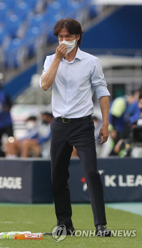 (울산=연합뉴스) 김용태 기자 = 26일 울산 문수축구경기장에서 열린 프로축구 하나원큐 K리그1 울산 현대와 성남FC의 경기에서 울산 홍명보 감독이 경기를 지켜보고 있다. 2022.6.26