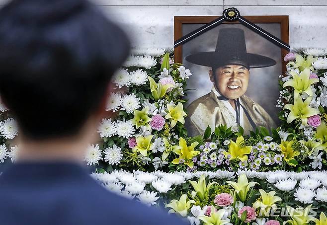 [서울=뉴시스] 정병혁 기자 = 민족사관고등학교의 설립자 최명재 전 파스퇴르유업 회장이 별세한 26일 오후 서울 송파구 서울아산병원 장례식장에 마련된 빈소를 찾은 조문객들이 조문을 하고 있다. 2022.06.26. jhope@newsis.com