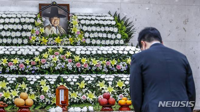 [서울=뉴시스] 정병혁 기자 = 민족사관고등학교의 설립자 최명재 전 파스퇴르유업 회장이 별세한 26일 오후 서울 송파구 서울아산병원 장례식장에 마련된 빈소를 찾은 조문객들이 조문을 하고 있다. 2022.06.26. jhope@newsis.com