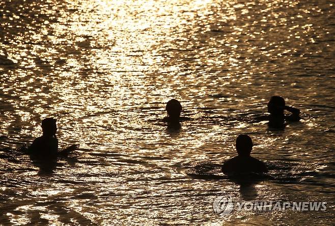 (강릉=연합뉴스) 유형재 기자 = 강원 강릉에 열대야 현상이 나타난 가운데 26일 저녁 강릉시 안목해변에는 많은 시민이 나와 수영을 하며 무더위를 식히고 있다. 2022.6.26
