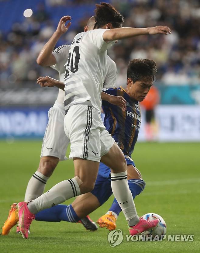 (울산=연합뉴스) 김용태 기자 = 26일 울산 문수축구경기장에서 열린 프로축구 하나원큐 K리그1 울산 현대와 성남FC의 경기에서 울산 박주영이 성남 수비진 사이에서 돌파 중 넘어지고 있다. 2022.6.26