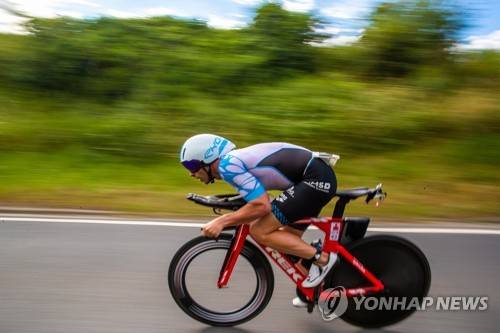 epa10034911 Sven Wies of Germany in action during the Cycling Race of the Ironman European Championship 2021? in Frankfurt am Main, Germany, 26 June 2022. EPA/CONSTANTN ZINN