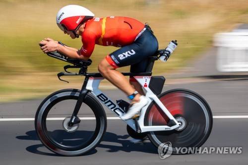epa10034919 Kristian Hogenhaug of Denmark in action during the Cycling Race of the Ironman European Championship in Frankfurt am Main, Germany, 26 June 2022. EPA/CONSTANTIN ZINN