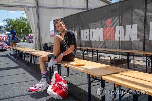 epa10034920 Lukas Schnoedewind of Germany looks on between the Cycling and the Marathon Race of the Ironman European Championship in Frankfurt am Main, Germany, 26 June 2022. EPA/CONSTANTIN ZINN