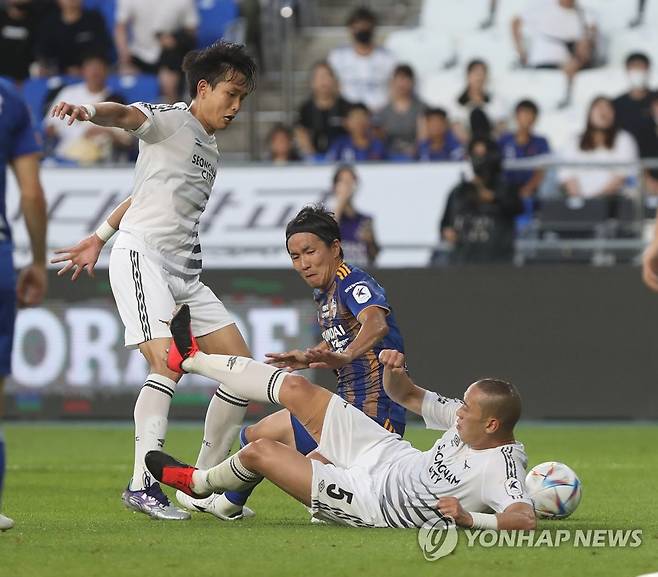 (울산=연합뉴스) 김용태 기자 = 26일 울산 문수축구경기장에서 열린 프로축구 하나원큐 K리그1 울산 현대와 성남FC의 경기에서 울산 아마노가 돌파 중 넘어지고 있다. 이 장면으로 울산의 페널티킥이 선언됐으나 비디오판독(VAR) 후 취소됐다. 2022.6.26
