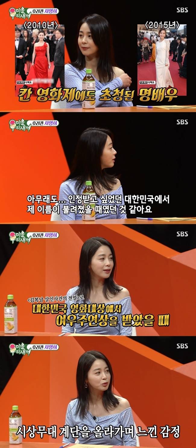 서장훈은 "배우로서 가장 벅차고 뿌듯했던 순간이 언제냐"라고 물었고 서영희는 "아무래도 인정받고 싶었던 대한민국에서 제 이름 석 자가 시상식에서 불렸던 순간 같다. 여우주연상에 불린 순간이 가장 행복했던 것 같다"고 회상했다.