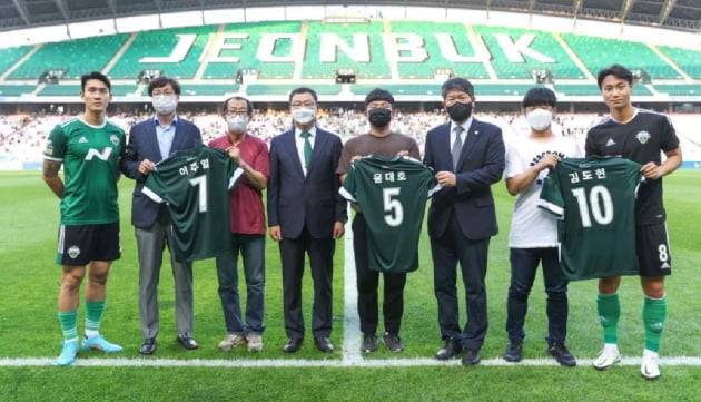 25일 전주월드컵경기장에서 진행된 전북현대모터스 통합축구단 창단식에 참석한 전북현대모터스 이용 선수(왼쪽부터), 한국프로축구연맹 한웅수 부총재, 스페셜올림픽 이주일 선수, 전북현대모터스 허병길 대표이사, 스페셜올림픽 윤대호 선수, 스페셜올림픽코리아 이용훈 회장, 스페셜올림픽 김도원 선수, 전북현대모터스 백승호 선수