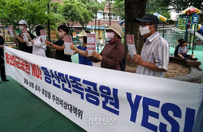 용산공원 북측살리기 주민비상대책위원회 관계자들이 26일 서울 후암동 새나라어린이공원에서 미군 잔류기지의 후암동 이전에 반대하는 집회를 열고 있다.