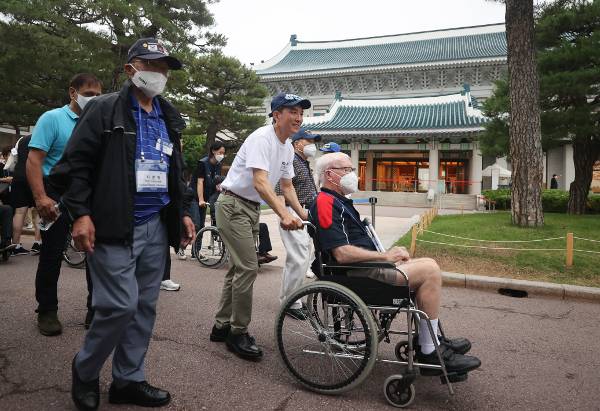 박민식(흰색 티셔츠) 국가보훈처장이 26일 오전 청와대를 방문한 6·25 해외 참전용사의 휠체어를 밀고 있다. 박 처장은 이날 6·25 발발 72주년을 맞아 방한한 9개국 60여명의 참전용사와 함께 청와대를 관람했다. 연합뉴스