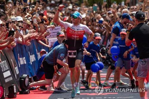 epaselect epa10035105 First placed Denis Chevrot of France reacts during the Ironman European Championship in Frankfurt am Main, Germany, 26 June 2022. EPA/CONSTANTIN ZINN