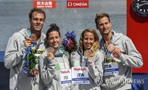 epa10035225 (L-R) Gregorio Paltrinieri, Giulia Gabrieleschi, Ginevra Taddeucci and Domenico Acerenza of the bronze medalist Italian team show their medal after the mixed 4x1500m open water swimming at the 19th FINA World Championships at Lupa lake near Budapest, Hungary, 26 June 2022. EPA/Zsolt Szigetvary HUNGARY OUT