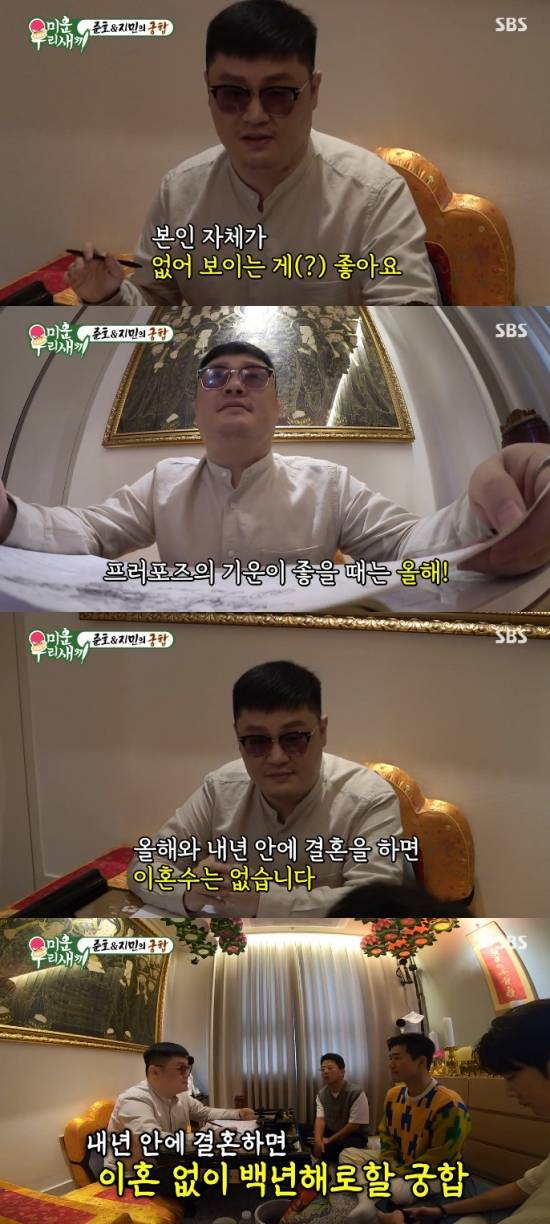 김준호는 "지민이가 저를 차진 않냐"라며 불안해했고, 역술인은 "결혼을 했을 때는 이혼수는 없다. 올해는 망신살이 붙어있다. 올바르게만 행동해라"라며 확신했다.