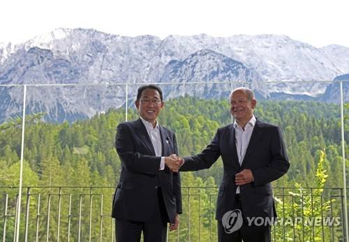 German Chancellor Olaf Scholz, right, shakes hands with Japan's Prime Minister Fumio Kishida prior to a bilateral meeting on the sidelines of the G7 summit at Castle Elmau in Kruen, near Garmisch-Partenkirchen, Germany, on Sunday, June 26, 2022. The Group of Seven leading economic powers are meeting in Germany for their annual gathering Sunday through Tuesday. (AP Photo/Matthias Schrader, Pool) POOL PHOTO