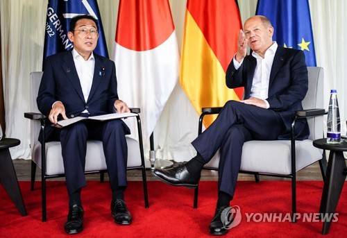 epa10035273 German Chancellor Olaf Scholz (R) and Japan's Prime Minister Fumio Kishida ahead of their bilateral meeting at Elmau Castle in Kruen, Germany, 26 June 2022. Germany is hosting the G7 summit at Elmau Castle near Garmisch-Partenkirchen from 26 to 28 June 2022. EPA/CLEMENS BILAN