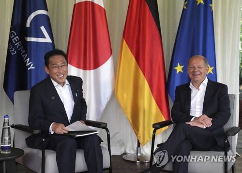 German Chancellor Olaf Scholz, right, and Japan's Prime Minister Fumio Kishida pose for photographers during a bilateral meeting on the sidelines of the G7 summit at Castle Elmau in Kruen, near Garmisch-Partenkirchen, Germany, on Sunday, June 26, 2022. The Group of Seven leading economic powers are meeting in Germany for their annual gathering Sunday through Tuesday. (AP Photo/Matthias Schrader, Pool) POOL PHOTO