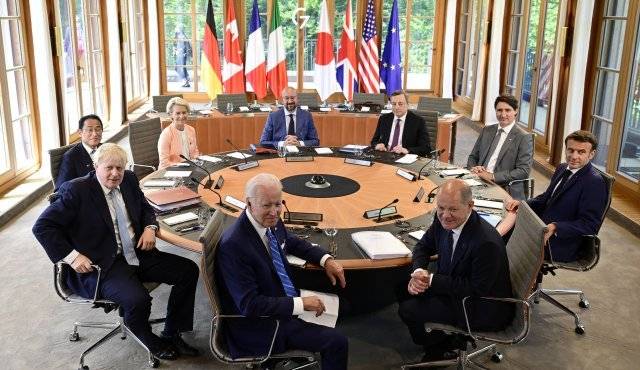 | 원탁에 둘러앉은 G7 정상들 주요 7개국(G7) 정상들이 26일(현지 시간) 회의 장소인 독일 남부 바이에른주 크륀의 엘마우성에 모여 있다. 앞줄 중앙 왼쪽부터 시계 방향으로 조 바이든 미국 대통령, 보리스 존슨 영국 총리, 기시다 후미오 일본 총리, 우르줄라 폰데어라이엔 유럽연합(EU) 집행위원장, 샤를 미셸 EU 정상회의 상임 의장, 마리오 드라기 이탈리아 총리, 쥐스탱 트뤼도 캐나다 총리, 에마뉘엘 마크롱 프랑스 대통령, 올라프 숄츠 독일 총리. 이들은 28일까지 3일간 회의에서 중국 및 러시아에 대한 견제 강화 방안을 논의하기로 했다. 크륀=AP 뉴시스 |