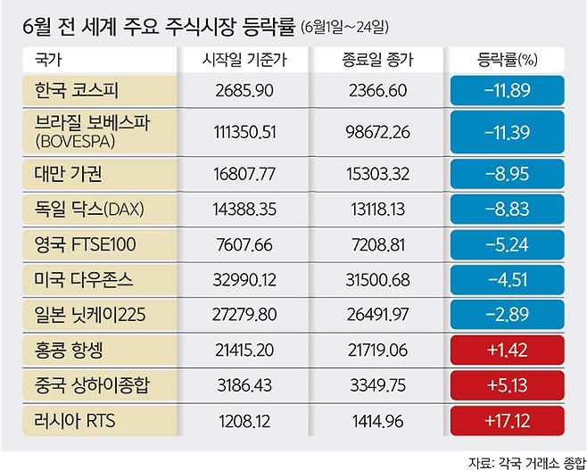 26일 한국거래소에 따르면, 지난 1일부터 24일까지 코스피 지수는 2685.9에서 2366.6으로 11.89% 하락한 것으로 나타났다. 같은 기간 코스닥 지수는 893.36에서 750.3으로 16.01%나 급락했다. 세계 주요 주식시장들도 대체로 하락했지만, 한국의 하락 폭이 가장 컸다. 세계 주식시장을 이끄는 뉴욕증시의 경우 다우존스가 -4.51%, 나스닥이 -3.92%였다. 영국 FTSE100의 경우도 -5.24%였다. 특히 아시아시장이 상대적으로 선방한 것과 비교해 보면 한국 주식시장의 하락은 더욱 뼈아프다. 일본 닛케이225의 경우 같은 기간 -2.89% 하락에 그쳤고, 홍콩항셍(1.42%), 상하이종합(5.13%) 등은 되레 상승했다. 우크라이나와 전쟁 중인 러시아의 RTS는 무려 17.12% 급등했다.