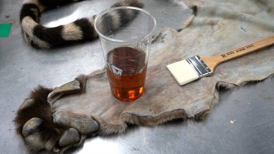 가죽을 씌운 후, 가죽이 머금고 있는 수분기가 없어질 때까지 건조합니다. 이때 가죽 모양이 변형될 수 있기 때문에 수시로 점검해야 하며, 군데군데 핀으로 고정해 놓습니다. 건조 과정을 거치면 털이 없는 부위의 색깔이 자연스럽게 바래기 마련인데요. 눈 주위나 코·입술 등의 부위를 해당 동물 고유의 색깔로 채색합니다.