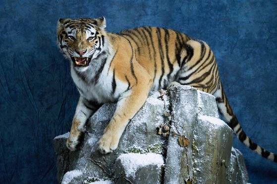 수장고의 주인공인 호랑이 두 마리도 학생기자단을 맞아줬습니다. 맹렬한 기세로 눈밭을 질주하며 먹잇감을 덮치기 직전인 이들은 서울대공원에서 자연사한 시베리아호랑이 ‘코아’와 ‘한울’이에요. 반쯤 벌어진 입, 곧추선 꼬리, 쭉 뻗은 앞발의 발톱, 도약 직전 힘이 들어간 뒷다리의 모습까지 세부적인 것 하나하나 살아 있는 호랑이와 다를 게 없었죠. 두 호랑이는 수년간 냉동고에 잠들어 있다 윤 박제사에 의해 다시 태어났어요.
