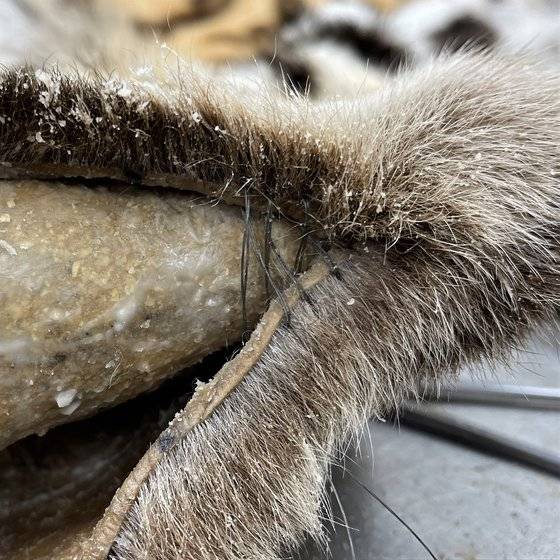 동물의 복부 중앙을 절개해 가죽을 몸통에서 조심스럽게 분리(스키닝)합니다. 이후 가죽에 붙어있는 살점과 지방을 제거하여 얇게 만들죠(견도). 이때 가죽이 상하지 않도록 서늘한 환경에서 신속히 진행하는 게 중요해요. 견도 후엔 태닝이라는 화학 처리 과정을 거쳐 가죽을 최종적으로 부드럽고 유연하게 만듭니다.