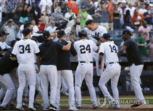 epa10035828 New York Yankees right fielder Aaron Judge (Top) reacts with his teammates at home plate after connecting on a walk off three run home run off Houston Astros relief pitcher Seth Martinez (Not Pictured) in the tenth inning during the Major League Baseball (MLB) game between the Houston Astros and New York Yankees at Yankee Stadium in the Bronx, New York, USA, 26 June 2022. The Yankees defeated the Astros 6-3. EPA/JASON SZENES