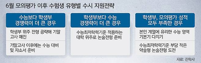우연철 진학사 입시전략연구소장은 “6월 모의평가 이후는 본인에게 유리한 수시전형을 찾아 전략을 수립하는 것이 매우 중요한 시기”라며 “특히 수능최저학력기준을 적용하는 대학의 경우 다른 전형요소보다 수능의 영향력이 커 기말고사 이후에는 수능 공부를 게을리해선 안 된다”고 설명했다.