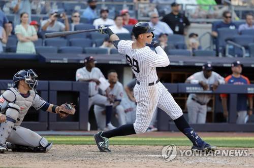 epa10035836 New York Yankees right fielder Aaron Judge watches his walk off three run home run off Houston Astros relief pitcher Seth Martinez (Not Pictured) in the tenth inning during the Major League Baseball (MLB) game between the Houston Astros and New York Yankees at Yankee Stadium in the Bronx, New York, USA, 26 June 2022. The Yankees defeated the Astros 6-3. EPA/JASON SZENES