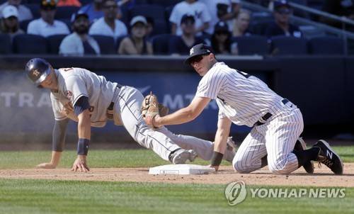 epa10035852 Houston Astros base runner Jason Castro (L) slides safely past New York Yankees third baseman DJ LeMahieu (R) glove in the tenth inning during the Major League Baseball (MLB) game between the Houston Astros and New York Yankees at Yankee Stadium in the Bronx, New York, USA, 26 June 2022. EPA/JASON SZENES