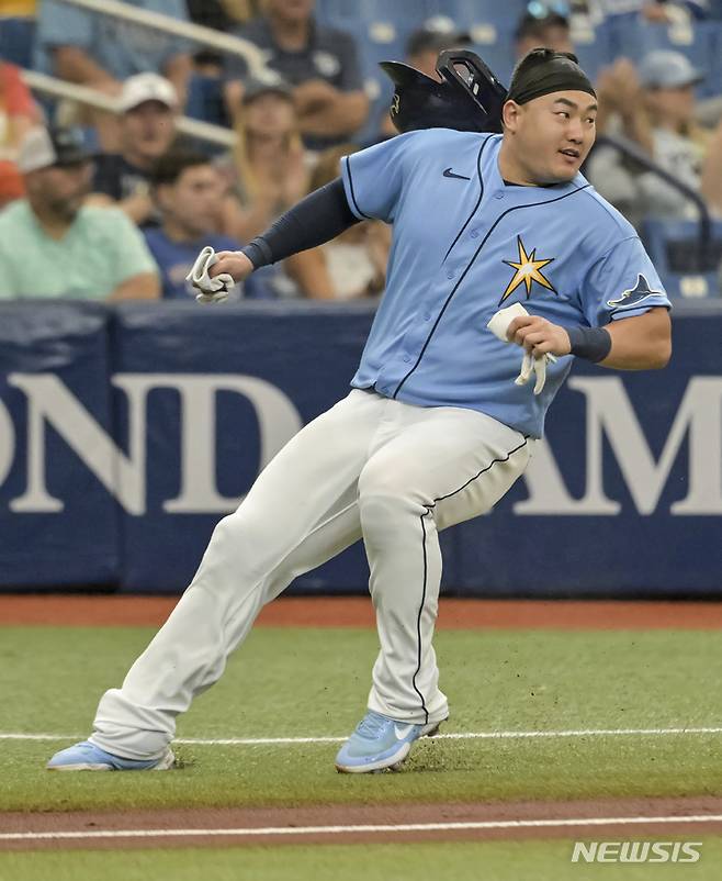 [세인트피터즈버그=AP/뉴시스] 탬파베이 레이스(TB)의 최지만이 26일(현지시간) 미 플로리다주 세인트피터즈버그 트로피카나 필드에서 열린 2022 메이저리그 피츠버그 파이어리츠와의 경기 3회 말 2루에서 조시 로우의 안타 때 3루를 돌다가 멈추고 있다. 최지만은 2타수 1안타 1타점 1득점 2볼넷을 기록했고 TB는 4-2로 승리했다. 2022.06.27.