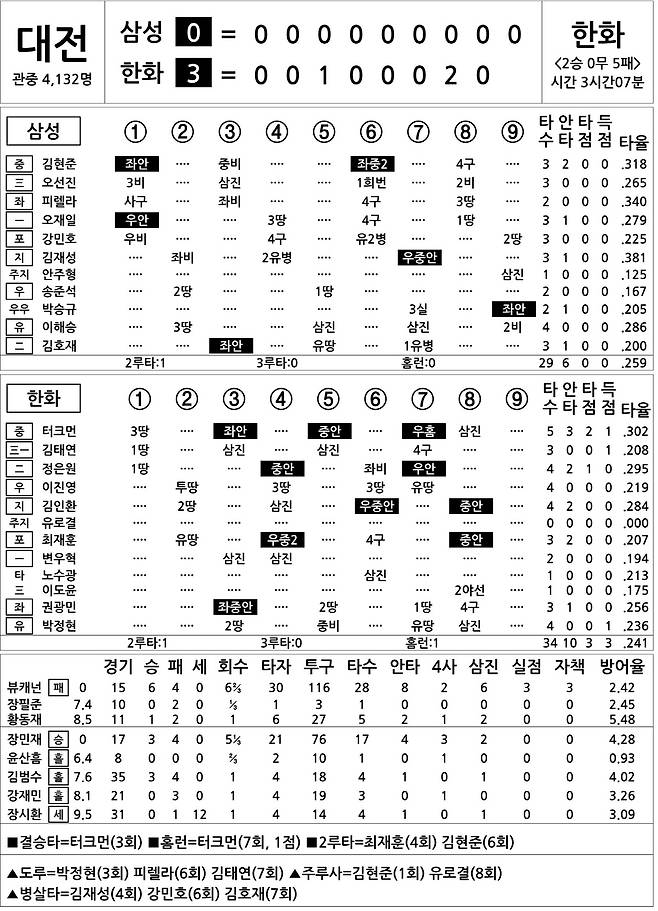 [2022 KBO리그 기록실] 삼성 vs 한화 (6월 24일)