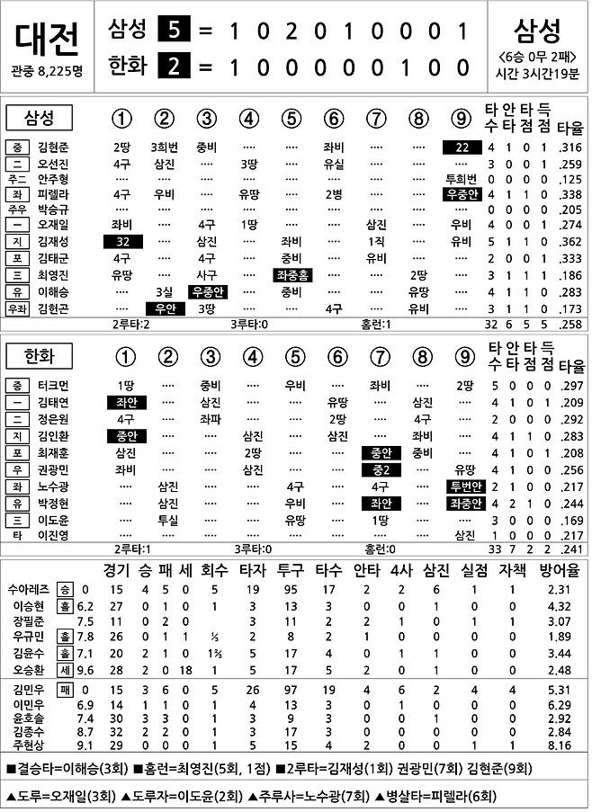 [2022 KBO리그 기록실] 삼성 vs 한화 (6월 25일)