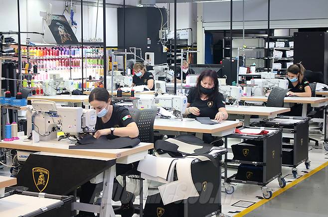 다음으로 둘러본 인테리어 공정은 고도의 숙련도를 요구하는 영역이다. 고객 맞춤 제작 프로그램인 애드 페르소남(Ad Personam)을 통해 선택한 특별 품목을 반영하는 곳이 바로 여기다. 이곳에선 전문 직원이 알칸타라 등의 소재가 불량이 있는지 예리한 눈빛으로 면밀히 확인하는 장면을 볼 수 있었다. 이를 통과한 원단에게만 람보르기니 제품의 대시보드나 도어 트림, 시트 등의 인테리어 요소로 변신할 수 있는 자격이 주어지는 셈이다. 전용 컴퓨터 시스템을 활용한 패턴 작업도 여기서 이뤄진다. 이 작업은 정밀한 가공뿐 아니라 재단 후 버려지는 가죽량을 줄이기 위해 마련됐다. 이렇게 잘 가공된 원단은 주문 제작을 위한 바느질 마감을 거치게 된다. 마감 색상은 수십 가지를 제공하며 소비자가 원하는 문구나 문양을 정교하게 새길 수 있다.