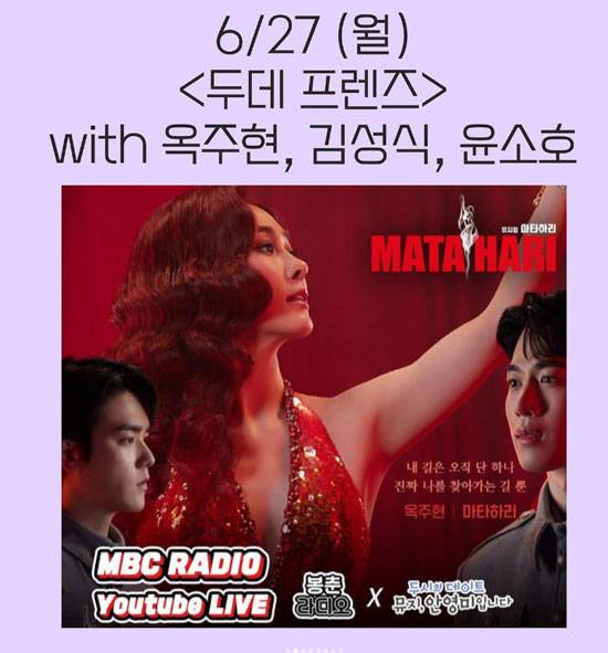 27일 MBC FM4U 라디오 '두시의 데이트 뮤지, 안영미입니다' 측은 "뮤지컬 '마타하리'의 배우 옥주현, 김성식, 윤소호가 오늘(27일) 출연한다"고 밝혔다.