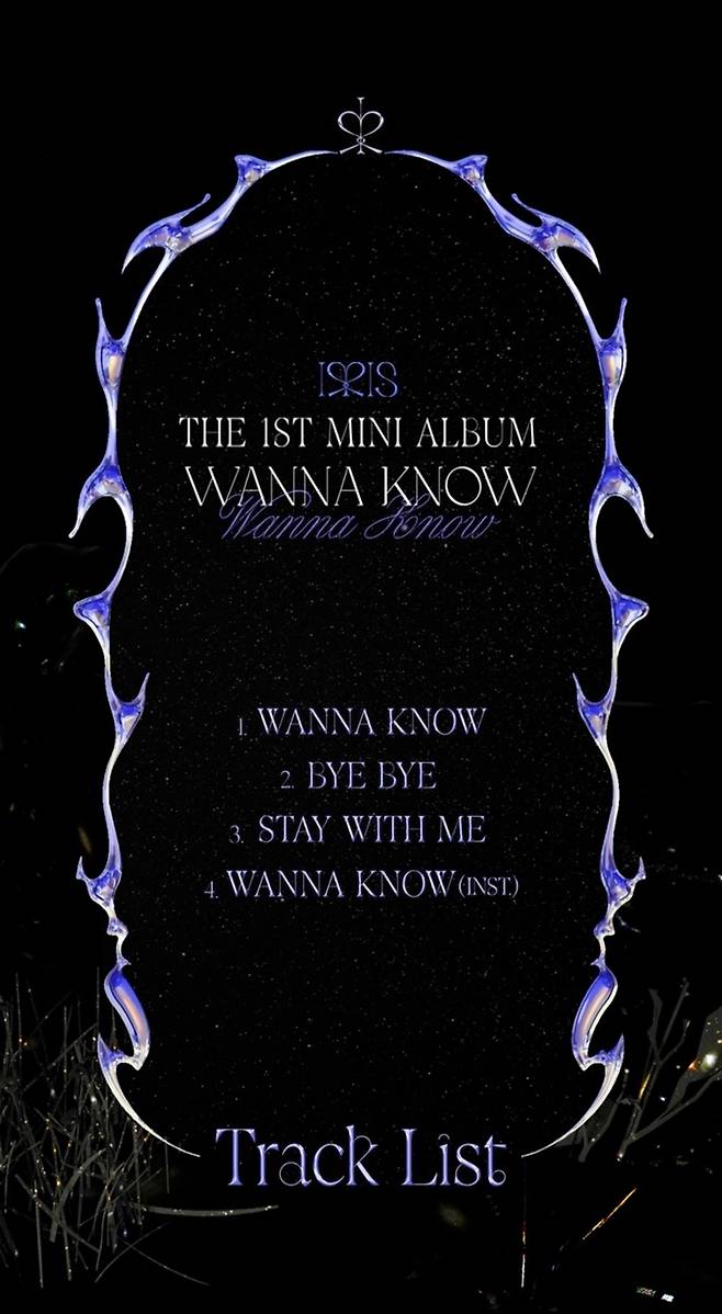 이에 따르면 IRRIS의 첫 미니앨범에는 'WANNA KNOW'을 비롯해 'BYE BYE(바이 바이)', 'STAY WITH ME(스테이 위드 미)', 'WANNA KNOW(INST)'까지 총 4곡이 수록돼 다채로운 장르에 대한 기대감을 더했다. 트랙리스트를 둘러싸고 있는 신비한 문양은 그동안 IRRIS가 선보여온 몽환적이고 신비한 분위기를 한층 돋보이게 하며 시선을 끌었다.
