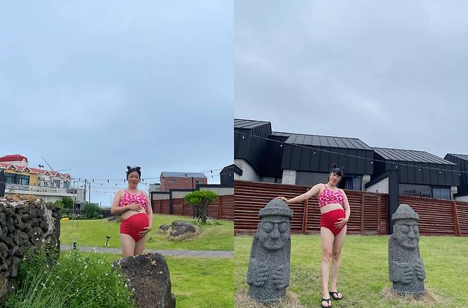사진에는 김영희가 빨간색 비키니를 입고 만삭 D라인을 뽐내는 모습이 담겼다. 화끈하게 만삭 몸매를 드러낸 김영희는 자신감 넘치는 포즈를 취하며 매력을 발산했다.