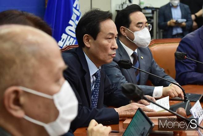 우상호 비대위원장이 27일 서울 여의도 국회 본관 206호에서 열린 더불어민주당 비상대책위원회의에 참석, 발언하고 있다.