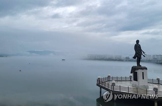 (춘천=연합뉴스) 양지웅 기자 = 전국 곳곳에 장맛비가 내리는 27일 강원 춘천시 소양강 위로 물안개가 피어오르고 있다. 2022.6.27