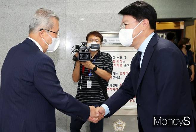 김종인 전 비상대책위원장은 27일 서울 여의도 국회 의원회관에서 열린 '대한민국 미래혁신포럼'에서 장제원 국민의힘 의원과 악수를 하고 있다.