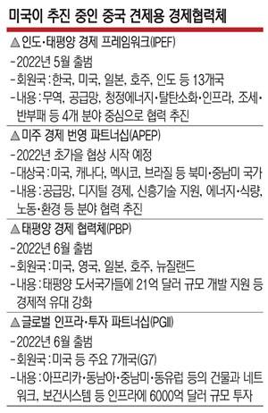 미국은 지난 5월 인도·태평양 경제 프레임워크(IPEF), 이달 초 미주 경제 번영 파트너십(APEP) 구상과 G7 정상회의 직전 발표한 태평양경제협력체(PBP)에 이어 PGII까지 발표하면서 중국 견제용 지역별 다자 경제협의체를 속속 구성하고 있다.